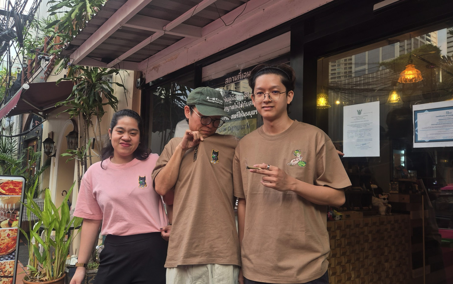 「GANJA MEN 驚奇甘蔗店」は、アソークエリアにある少しユニークな存在の大麻薬局として知られています。特に特徴的なのは、店内に珍しい品種とされるスフィンクスの猫が複数いることです。猫好きの大麻愛好家にとっては、一般的なディスペンサリーとは異なる体験ができる空間といえるかもしれません。猫をモチーフにした数量限定のTシャツも展開しており、タイ土産として購入する人もいるようです。自分自身も猫と大麻が好きということもあり、応援の意味も込めて着用しています。