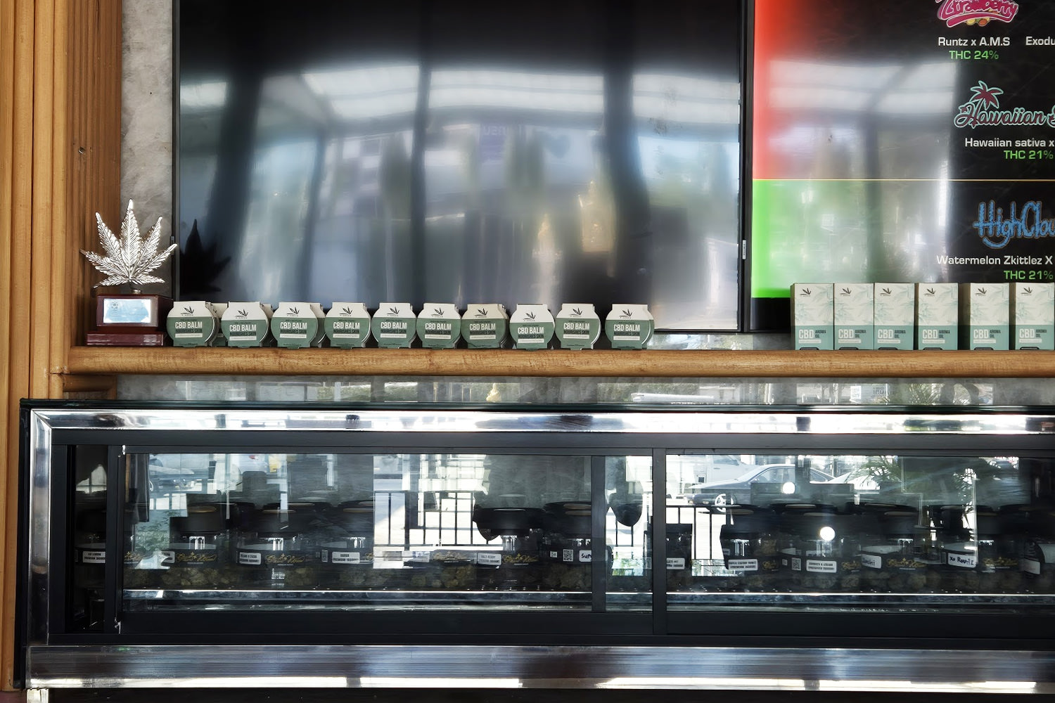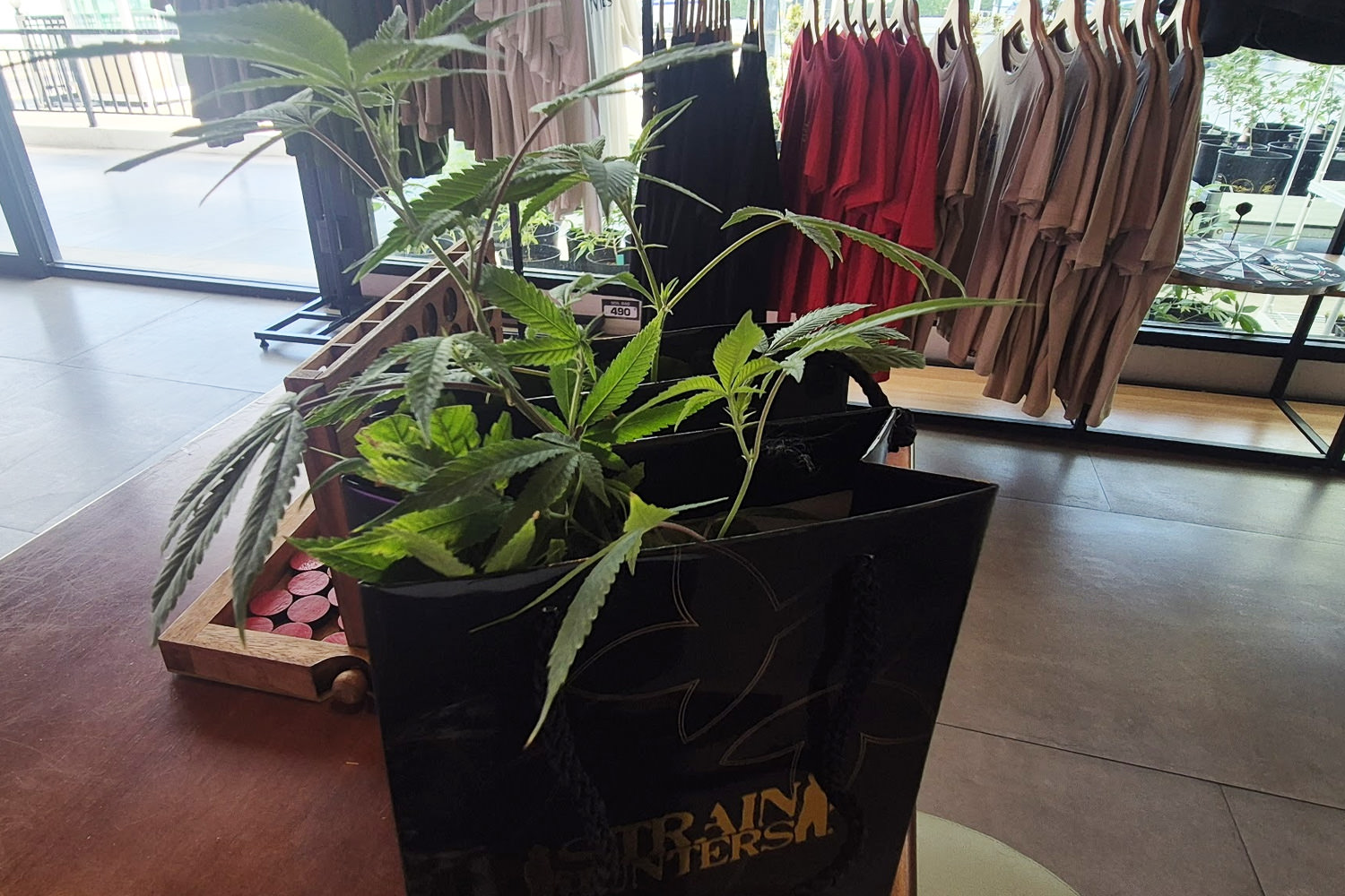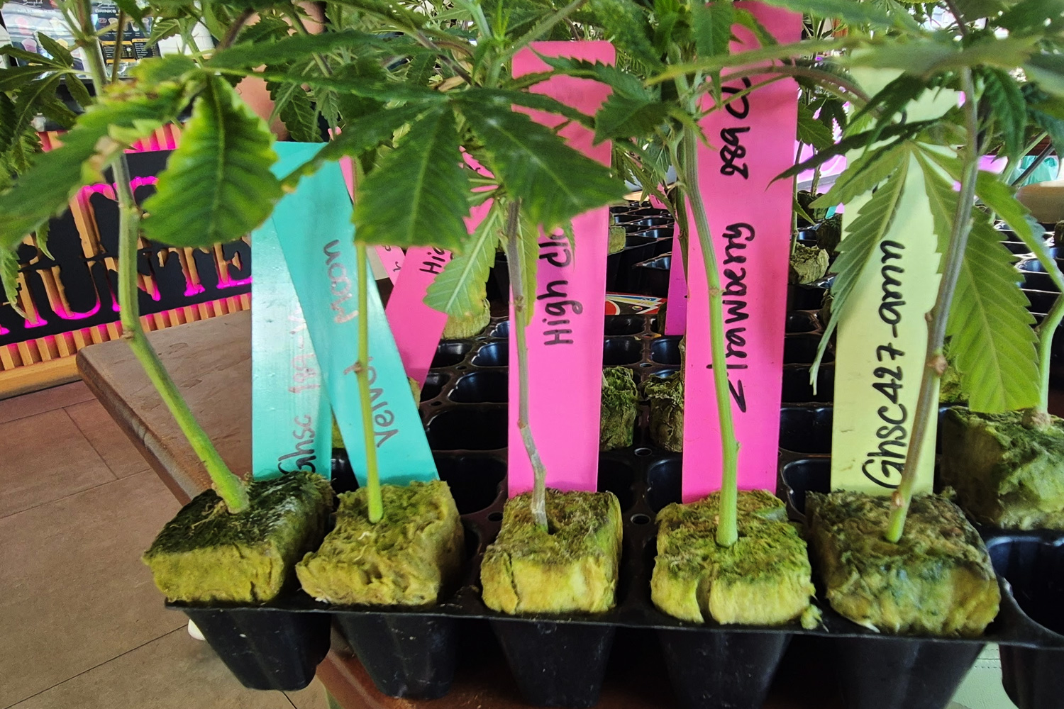 店舗に入る前に左手にガラス越しですが栽培室を見ることが出来ます。栽培されてるのはオートとフェノの2種類が育てられていて、ここで収穫された大麻も店頭で販売されています。残念ながら栽培室には一般の方は入室は出来ません。