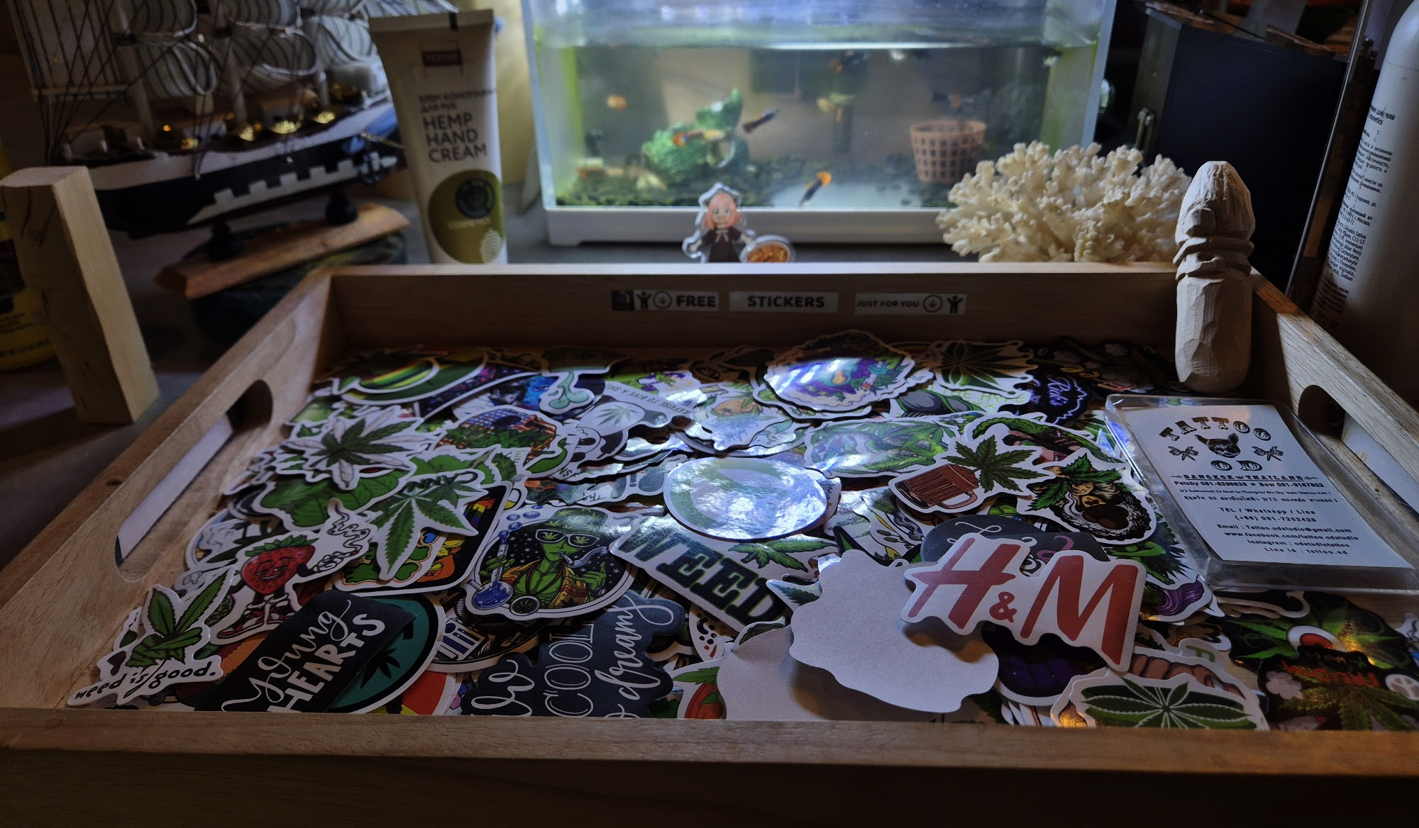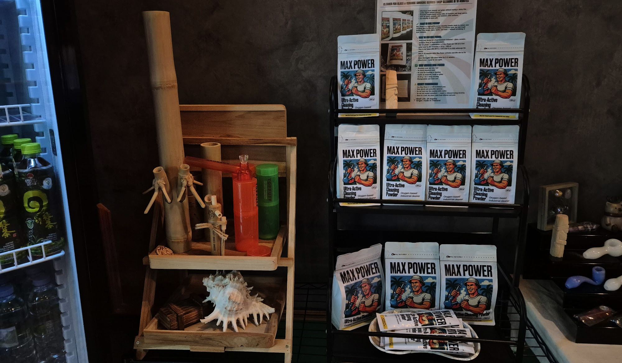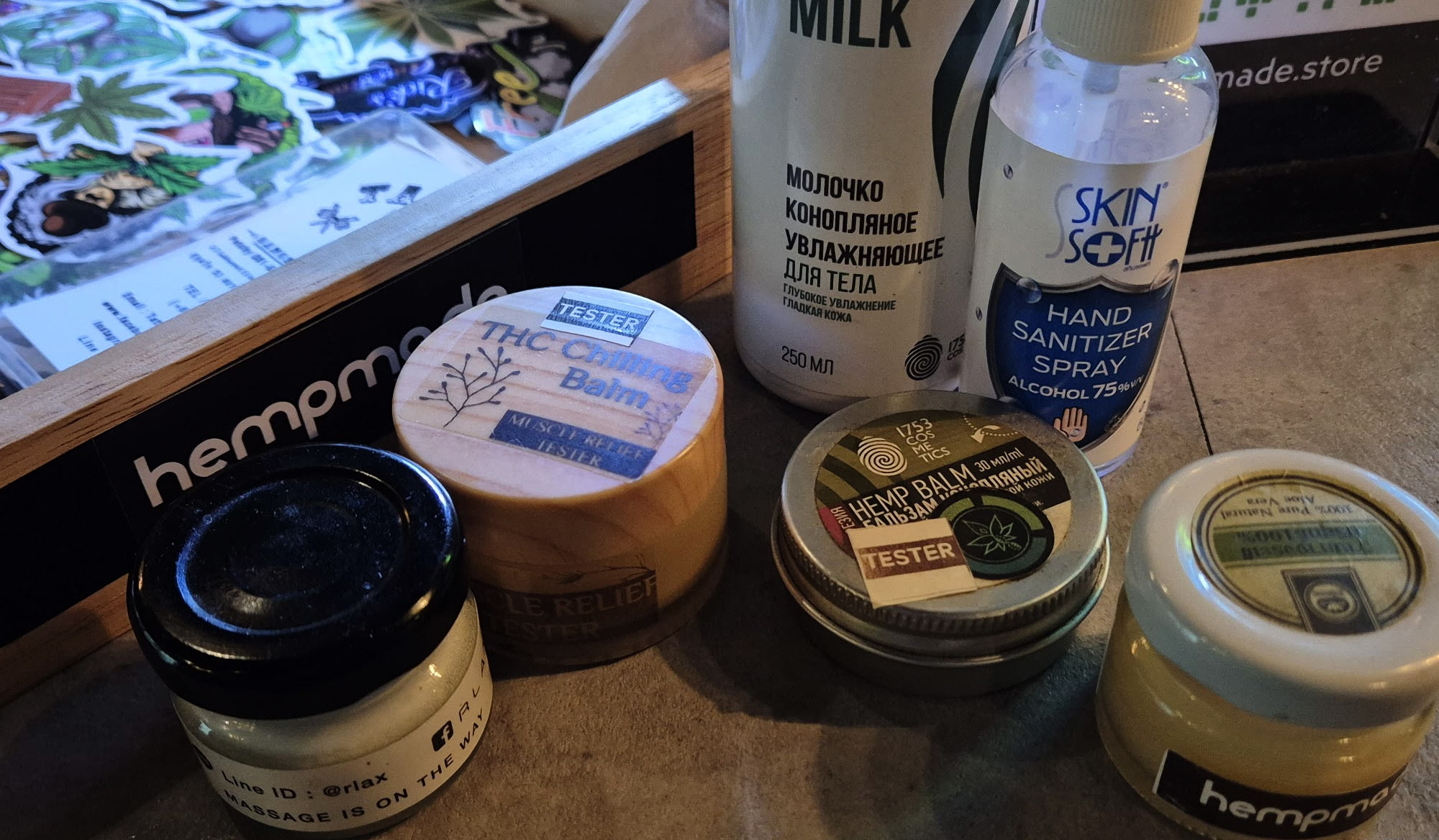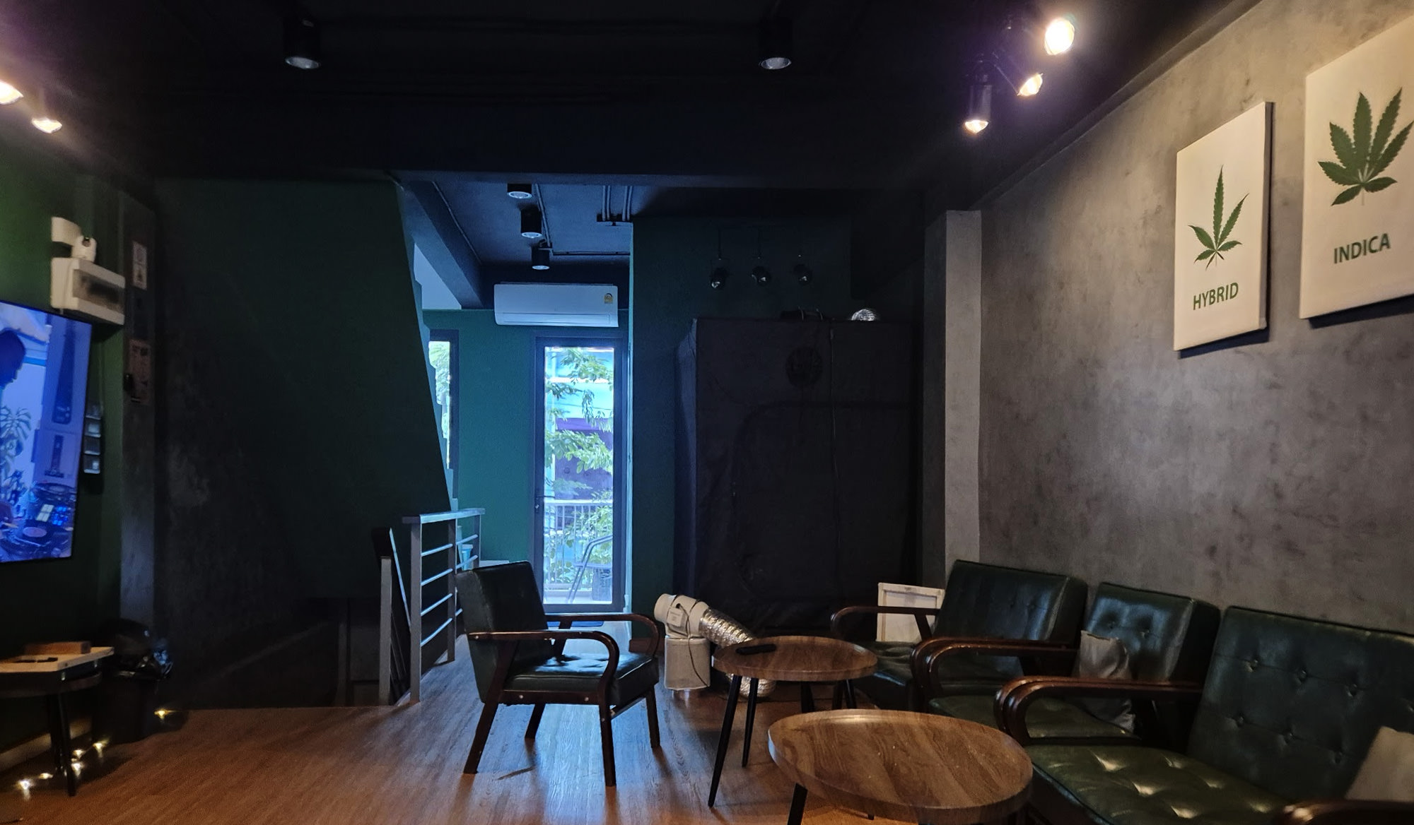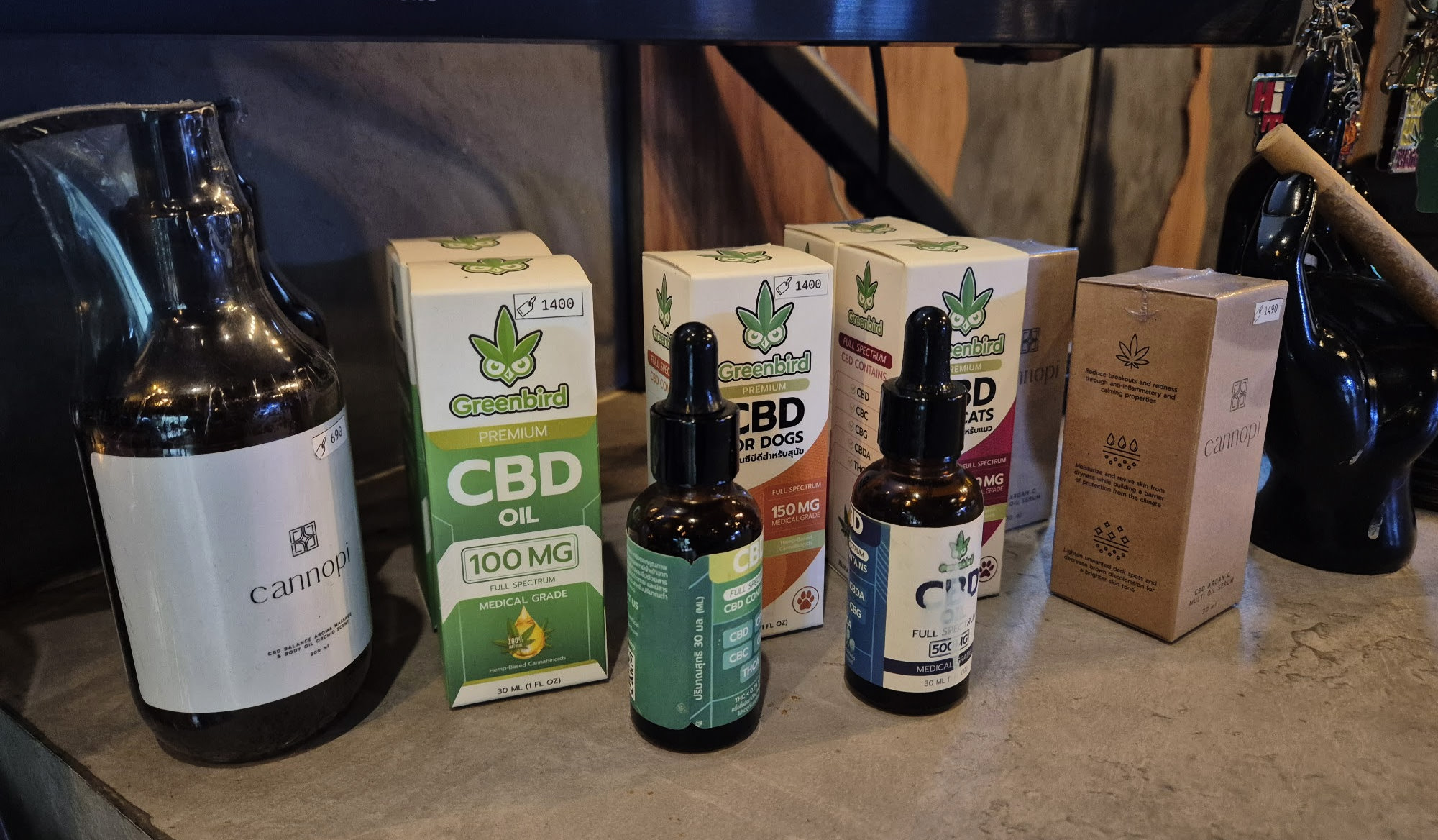 1階スペースでは、大麻を吸う人に必須のスモーキングツールからCBD製品まで幅広く取り扱っています。販売されてるCBDは、タイ国内で信頼されているGreenbirdとCannopiの2ブランド。Greenbirdは「Medical Grade」「Full Spectrum」を掲げ、100mgのライトタイプから500mgの高濃度タイプ、さらに犬・猫向けのペットCBDまで展開しており、タイ産ヘンプ由来の自然な成分でストレス緩和や安眠をしっかりサポートします。一方、Cannopiはミニマルなデザインと丁寧な抽出技術が特徴で、心身を落ち着かせるバランス系チンキを中心にラインナップ。どちらも使いやすく、テスターもあるので興味ある人はチャレンジしてみましょう!また、無料でステッカーも貰えるので医療大麻買うついでに大麻関連のステッカーもゲットしよう。