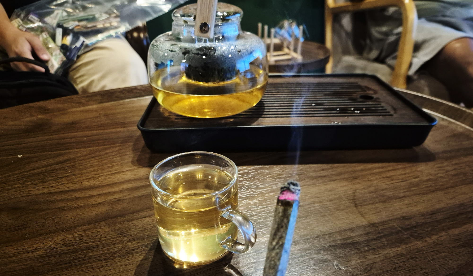 この日はまだ夜もミーティングも続くので精神は軽く明るいまま、体だけが静かに解けていくような心地よいアンバランスさが特徴な「MellowZ」を店の中にいた大麻愛好家の人たちと大麻とジャスミン茶を楽しみながら会話を1時間ほどチル。