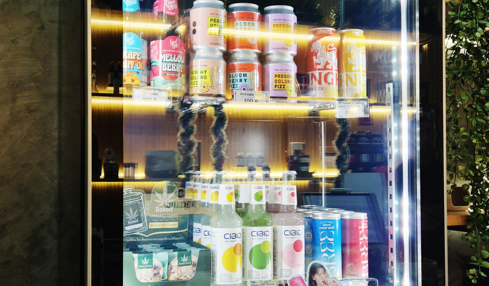 このショーケースには、大麻エディブルやCBDドリンク、ノンアルコール飲料が並び、「吸う以外の楽しみ方」を直感的に選べる構成になっています。