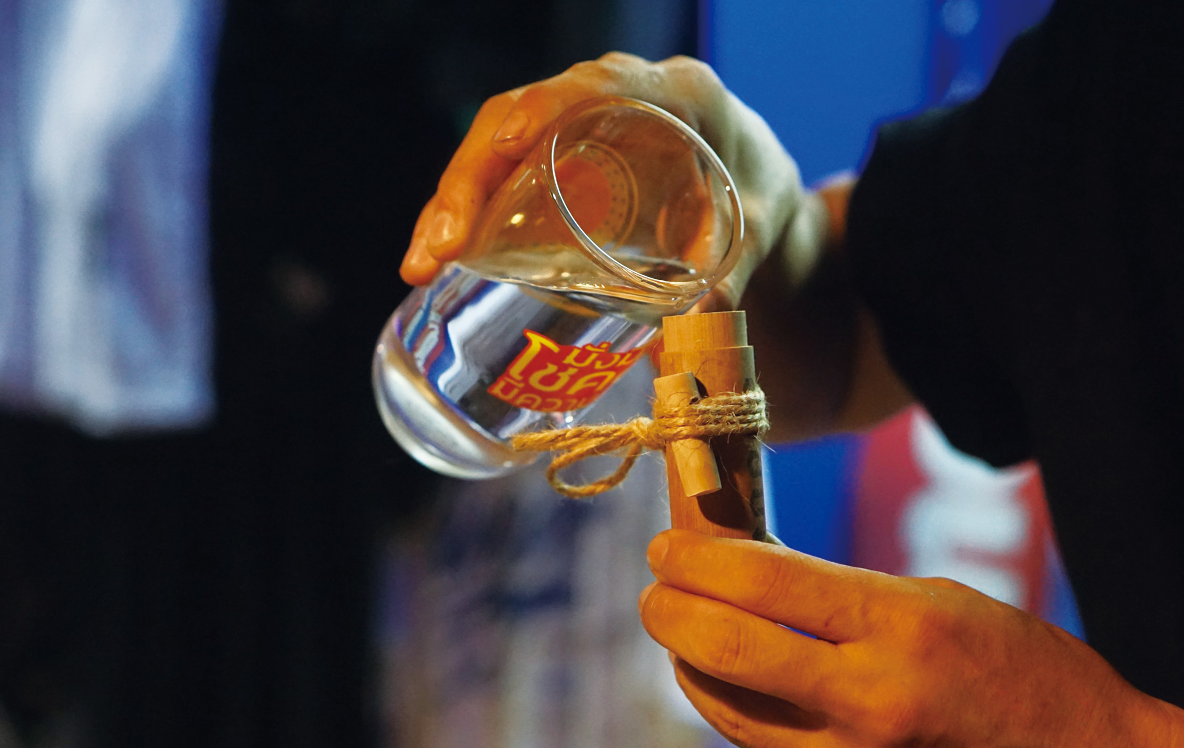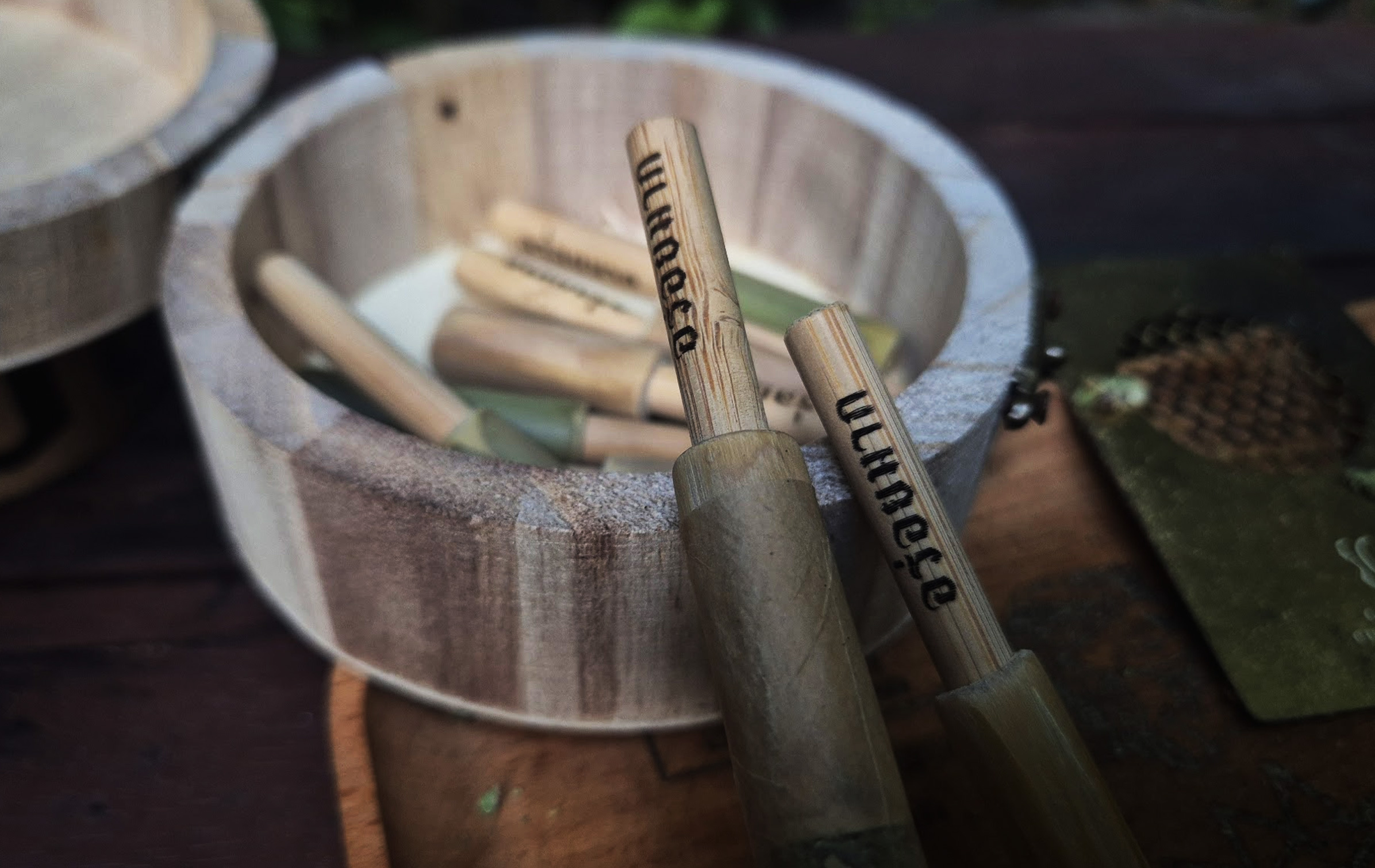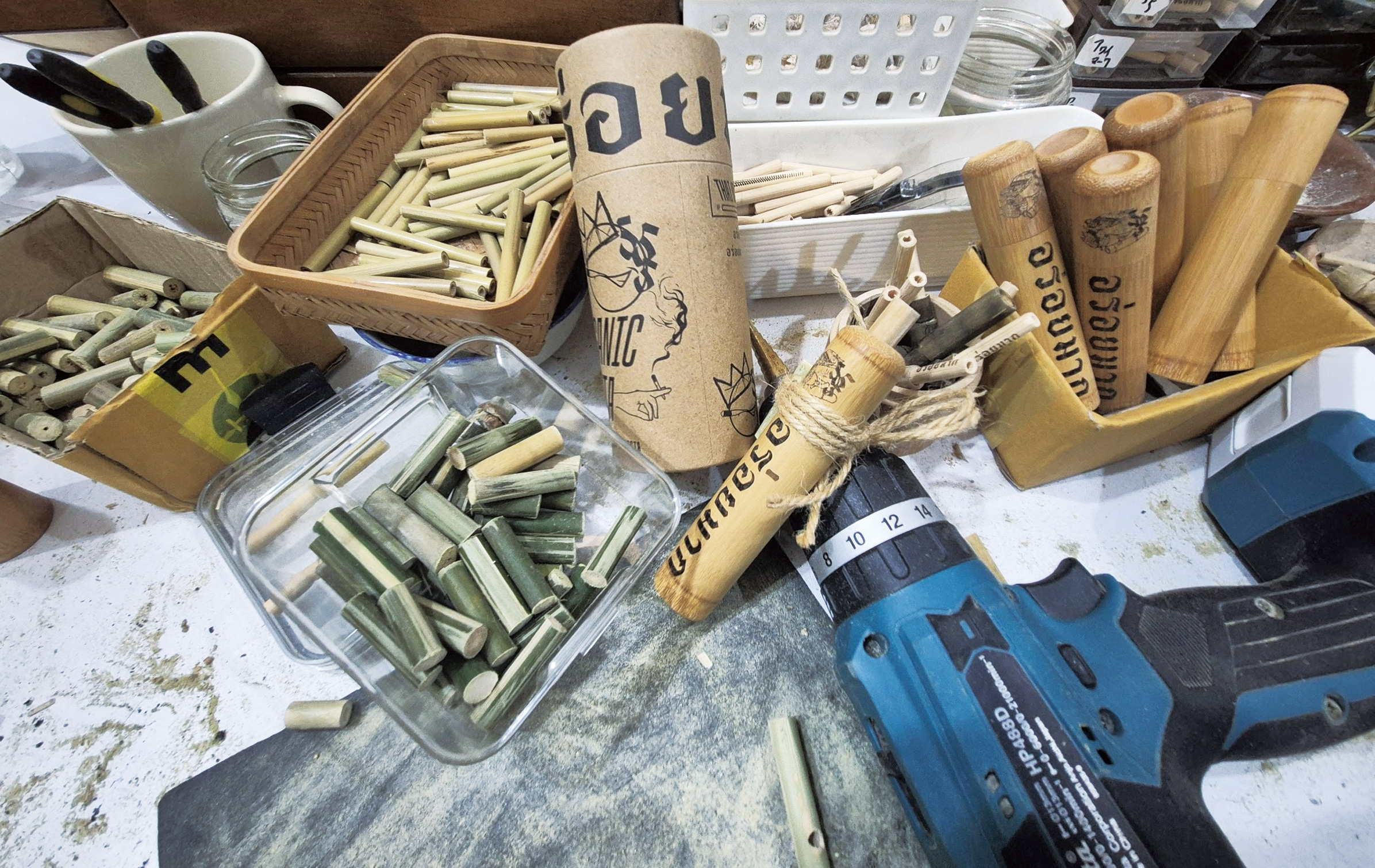 竹フィルターにはタイ語で「アロイマーク(とても美味しい)」とレザープリンターで書かれており、このフォントはタイのお寺でよく使われるフォントスタイルを採用しています。タイでも古くから大麻が生活の近くにあったのにいまだにドラッグと考える人が多い背景から反骨精神を表現するためにお寺のフォントスタイルを取り入れています。美味しい医療大麻を吸えば、色々な問題を解決するきっかけになります。