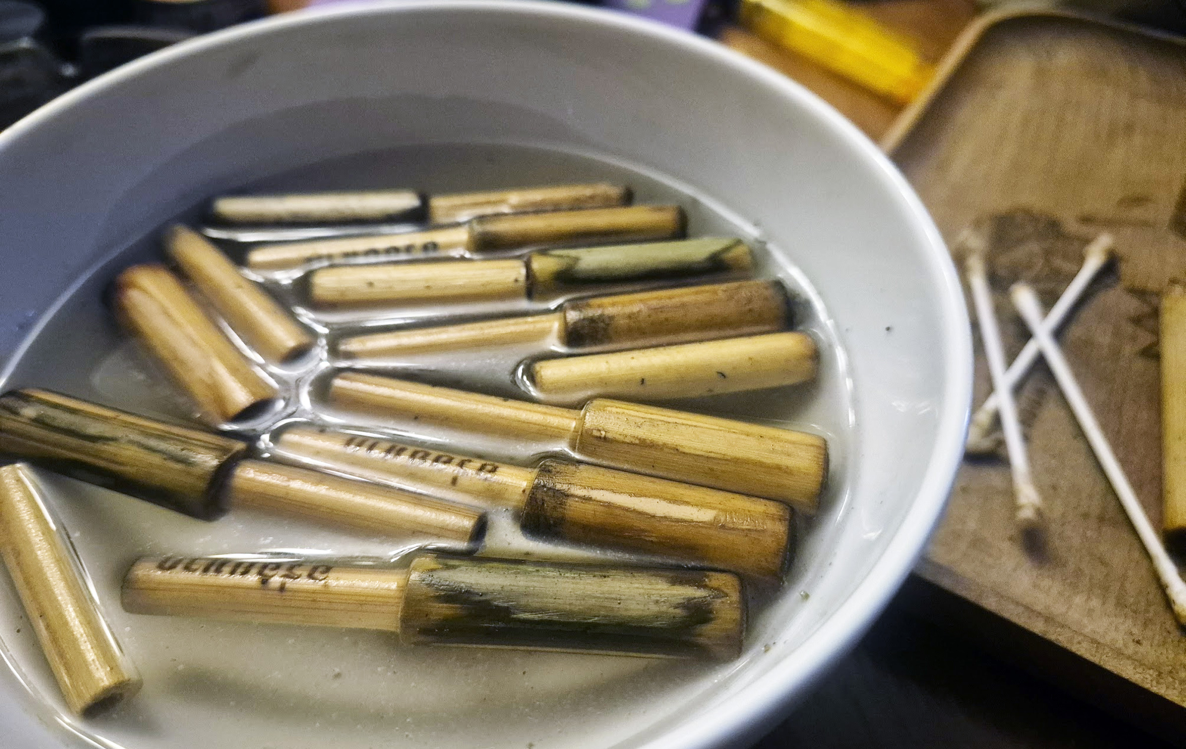 水は竹筒の半分ほど入れて、一度蓋をしてから、竹ストローを差し込んで、吸い込んでみます。”ぷくぷく”と音が鳴ったらOKです。水が足りない場合は音が鳴らず、水が多い場合は水が口元に入りますのでご注意を。