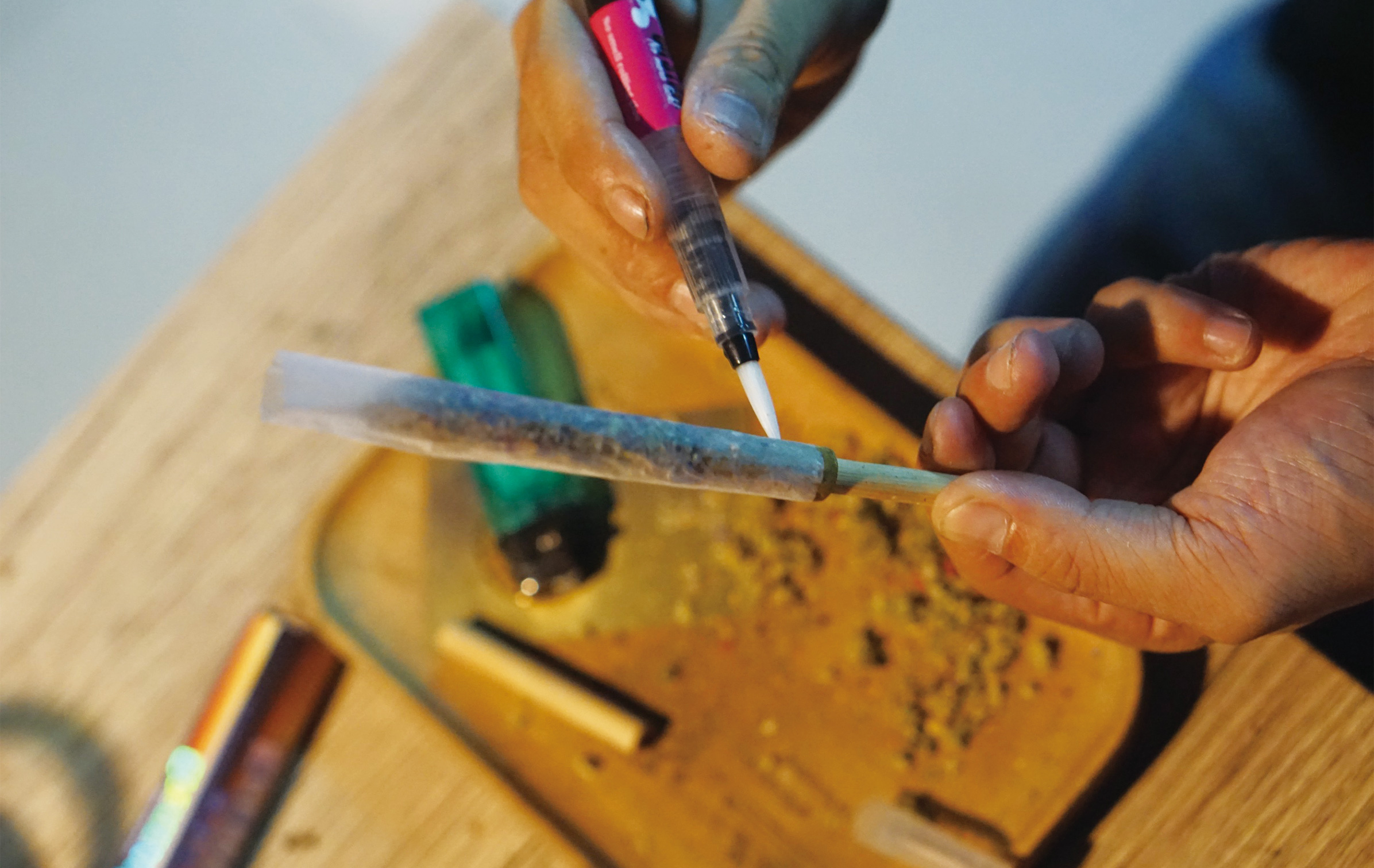 ジョイントのノリ部分はウォーターペン(水ペン)を使うことで唾液を使わずに水だけでペーパーを密着させられます。ペン先から適量の水が出る構造で、必要な部分だけをきれいに湿らせられるのが特徴。誰かとシェアして吸う場面でも衛生的で、相手に気を使わせません。海外ではエチケットとして使われることも多く、「一緒に吸う時間を気持ちよく保つための道具」として、大麻愛好家の間で支持されています。